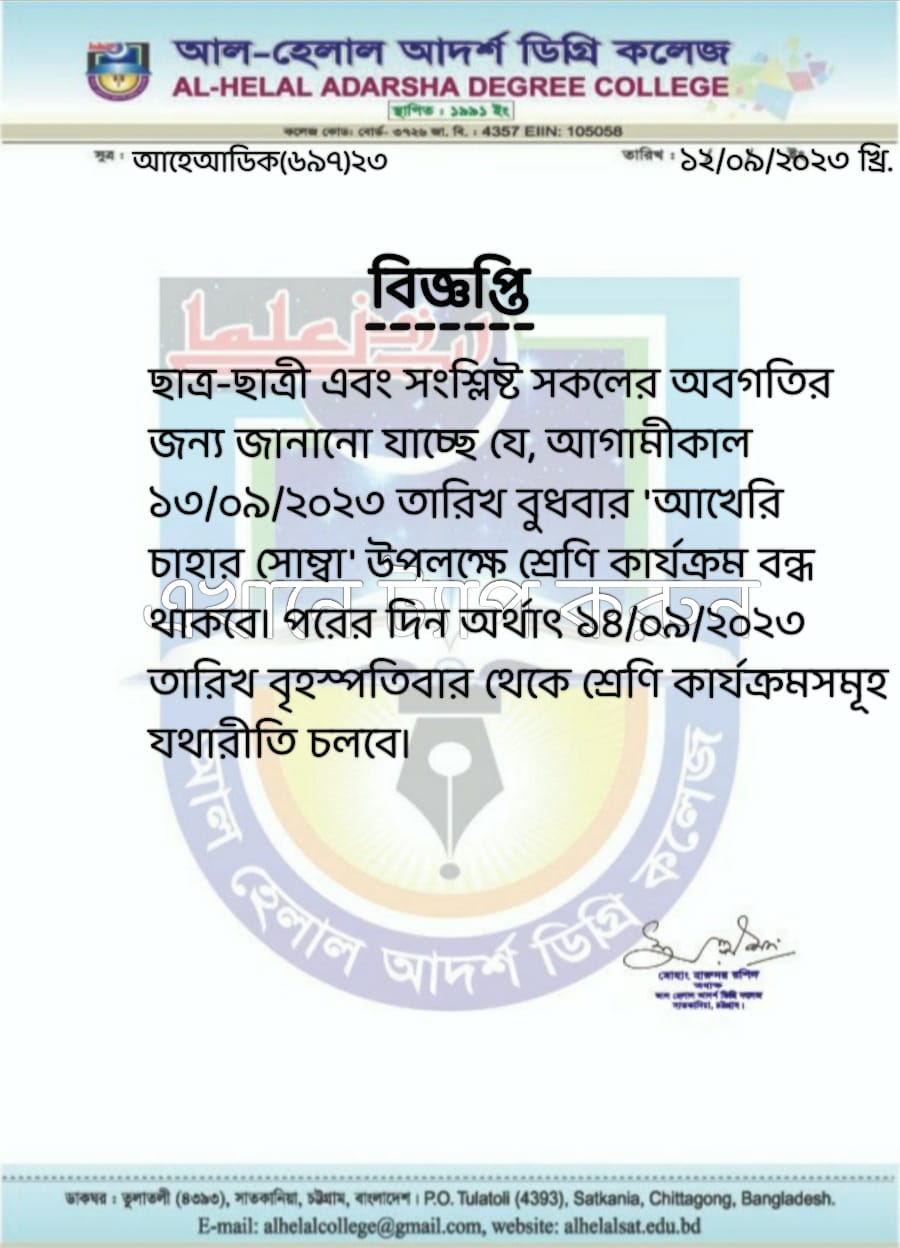 ‘আগেরি চাহার সোম্বা’ উপলক্ষে আগামীকাল শ্রেণি কার্যক্রম বন্ধের বিজ্ঞপ্তি।